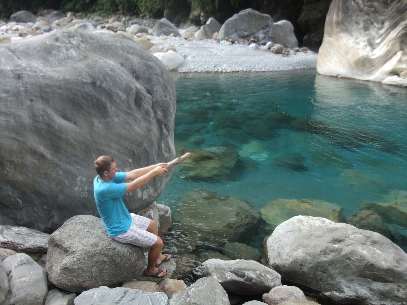 再來,就是今天最完美的時刻。美麗的砂卡噹步道!你是我們台灣的驕傲!就是因為這裡,我很臭屁的跟Lauri說,你看這邊的水跟紐西蘭一樣清澈碧綠對吧!這就是台灣!哈哈!然後兩個人就在這享受了環島行程中最放鬆的時刻。雖然為保護水源,禁止釣魚玩水,但我們還是稍微碰了一下水,順便在岸邊拍幾張照,窮開心。